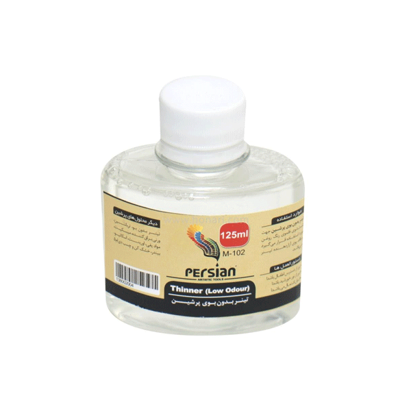 تینر بی بو پرشین محلول بدون رنگ و کم بو می باشد. مناسب برای استفاده در فضای داخلی و برای کسانی که به بو حساس هستند. برای رقیق کردن رنگ و همچنین برای تمیز کردن قلمو و پالت ها استفاده می شود. در سایز 60 و 125 میل موجود است.