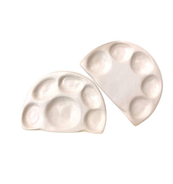 پالت های سرامیکی موجود ، دست ساز هستند و در اندازه های متفاوت باتوجه به کاربرد شما ، مخصوص آبرنگ ، ویترای ، رنگ روغن ، جوهر و اکرلیک میباشند و با توجه به اینکه توسط هنرمندان ساخته و طراحی شده اندازه های متنوعی دارد و همچنین رنگ از روی آن به راحتی پاک میشود و کاملا قابل شستشو میباشند و برخلاف پالت های پلاستیکی رنگ نمیگیرند و رنگ پالت همیشه سفید و تمیز خواهد بود .
