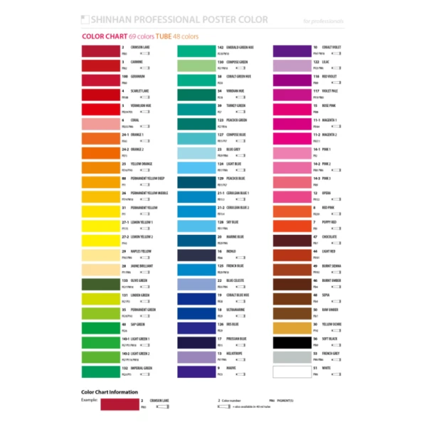 گواش شین هان با کیفیت عالی. کیفیت بالای رنگدانه ها و با انعطاف پذیری بالا. قابلیت ترکیب کردن رنگ ها با حفظ کیفیت رنگ جدید. دارای رنگ های درخشان و شفاف. در 69 رنگ متنوع و سایز 40 میل موجود است. محصول کشور کره.