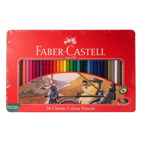 مداد رنگی کلاسیک فابر کاستل با جعبه فلزی با کیفیت بسیار عالی و نوک نرم. به دلیل داشتن بدنه ی چوبی با طراحی کلاسیک از غلت خوردن روی میز جلوگیری کرده و در استفاده طولانی مدت دست را خسته نمی کند و به آن آسیبی نمی زند. سایز قطر مغز مدادها 3.3 میل می باشد و د ر برابر فشار بسیار مقاوم است و نمی شکند(به دلیل استفاده از فراینده اتصال امن (SV)). مدادی نرم با رنگ های متنوع و درخشان که با آن سطح بیشتری را می توان پوشش داد. قابلیت ترکیب رنگ ها در چندین لایه. با محل درج اسم بر روی بدنه مداد. شامل رنگ های طلایی. در بسته بندی فلزی و در ست های 12، 24، 36، 48، 60 و 100 رنگ موجود است.